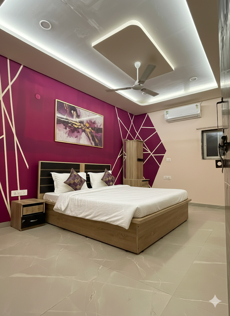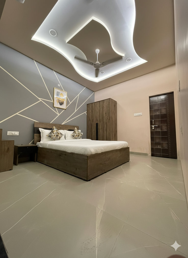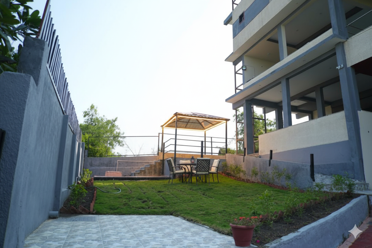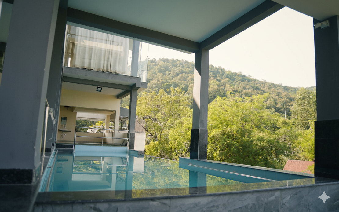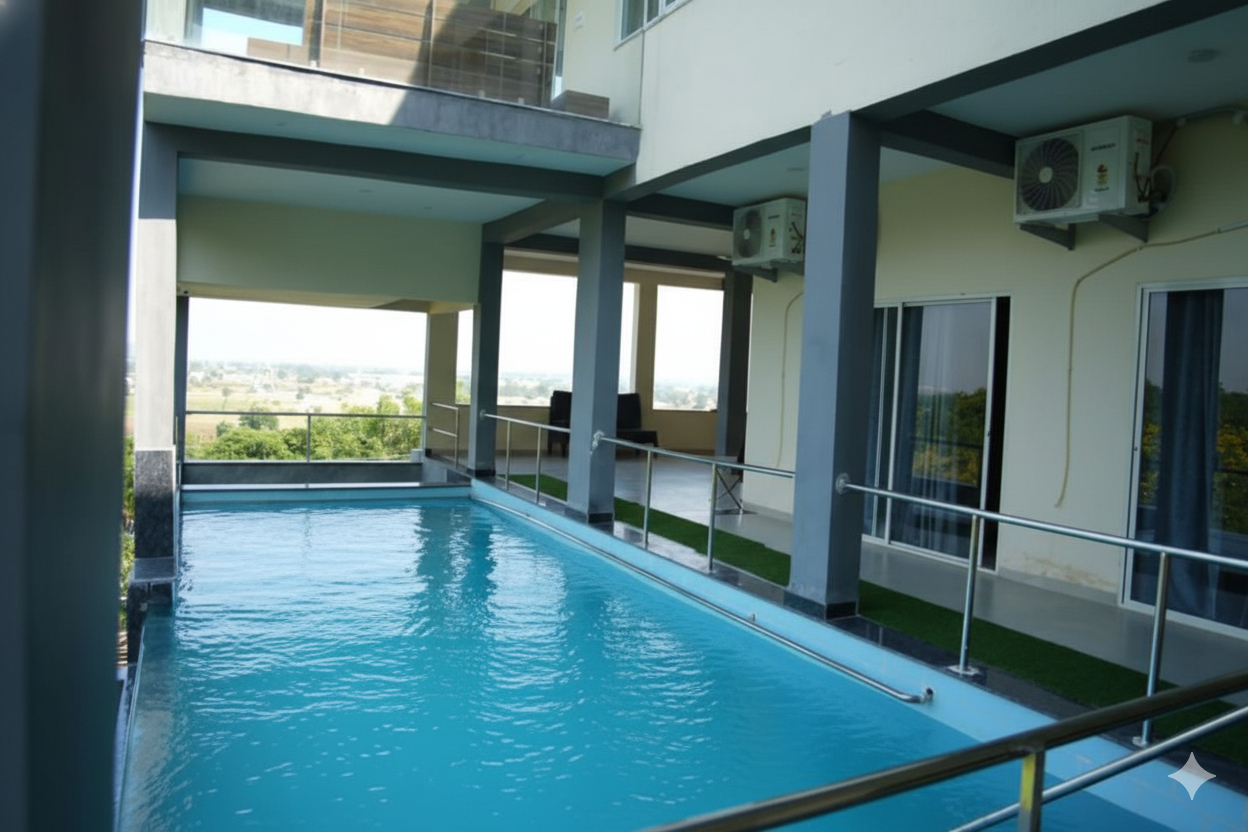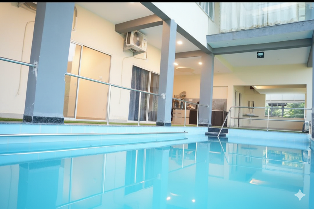 A premium farmhouse retreat featuring designer bedrooms, indoor temperature-controlled pool, hill-facing views and a peaceful outdoor lounge area — the perfect stay for celebrations.